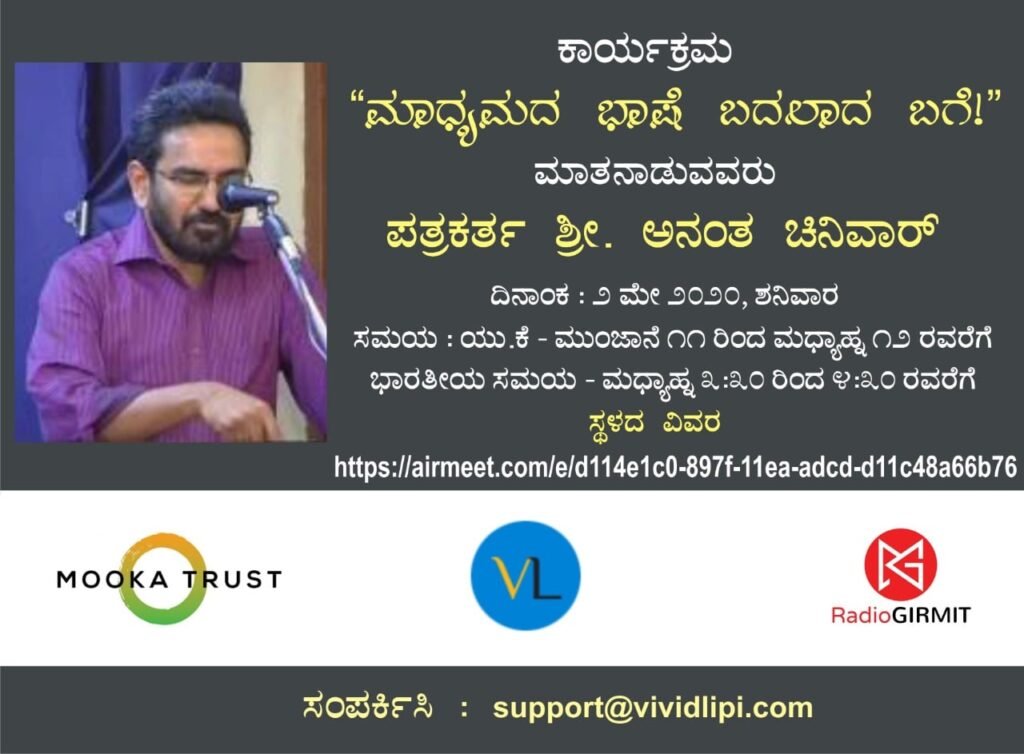 ಕಾರ್ಯಕ್ರಮ: “ಮಾಧ್ಯಮದ ಭಾಷೆ ಬದಲಾದ ಬಗೆ!” ನಮ್ಮೊಡನೆ ಮಾತನಾಡುವವರು – ಪತ್ರಕರ್ತ ಶ್ರೀ. ಅನಂತ ಚಿನಿವಾರ್ ಇವರು ಜನಶ್ರೀ, ಪಬ್ಲಿಕ್ ಟಿ ವಿ, ಸುವರ್ಣ ನ್ಯೂಸ್ ಹಾಗೂ