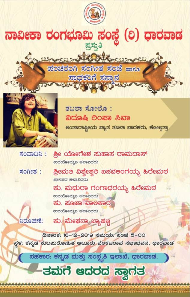 ನಾವೀಕಾ ರಂಗಭೂಮಿ ಸಂಸ್ಥೆ(ರಿ)ಧಾರವಾಡ ಪ್ರಸ್ತುತಿ ಪಂಚರಂಗಿ ಸಂಗೀತ ಸಂಜೆ ಹಾಗೂ ಸಾಧಕರಿಗೆ ಸನ್ಮಾನ ತಬಲಾ ಸೋಲೋ:ವಿದೂಷಿ ರಿಂಪಾ ಸಿವಾ ಅಂತರಾಷ್ಟ್ರೀಯ ಖ್ಯಾತ ತಬಲಾ ವಾದಕರು,ಕೋಲ್ಕತ್ತಾ ಸಂವಾದಿನಿ:ಶ್ರೀ ಯೋಗೇಶ