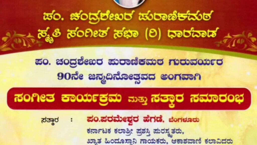 ಪಂ. ಚಂದ್ರಶೇಖರ ಪುರಾಣಿಕಮಠ ಗುರುವರ್ಯರ ೯೦ನೆಯ ಜನ್ಮದಿನೋತ್ಸವ ಅಂಗವಾಗಿ ಸಂಗೀತ ಕಾರ್ಯಕ್ರಮ ಮತ್ತು ಸತ್ಕಾರ ಸಮಾರಂಭ.