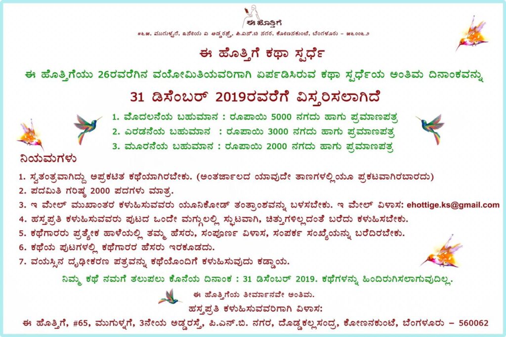 ಈ ಹೊತ್ತಿಗೆ # ೬೫ , ಮುಗುಳ್ಳಗೆ , ೩ನೇಯ ಎ ಅಡ್ಡರಸ್ತೆ , ಪಿ . ಎನ್ . ಚಿ ನಗರ , ಕೋಣನಕುಂಟೆ , ಬೆಂಗಳೂರು – ಚಿಕೆ ೬೦೦೬೨ ಈ ಹೊತ್ತಿಗೆ ಕಥಾ ಸ್ಪರ್ಧೆ ಈ ಹೊತ್ತಿಗೆಯು 26ರವರೆಗಿನ ವಯೋಮಿತಿಯವರಿಗಾಗಿ ಏರ್ಪಡಿಸಿರುವ ಕಥಾ ಸ್ಪರ್ಧೆಯ ಅಂತಿಮ ದಿನಾಂಕ 31 ಡಿಸೆಂಬರ್ 2019                    1 .ಮೊದಲನೆಯ ಬಹುಮಾನ : ರೂಪಾಯಿ 5000 ನಗದು ಹಾಗು ಪ್ರಮಾಣಪತ್ರ 2 . ಎರಡನೆಯ ಬಹುಮಾನ : ರೂಪಾಯಿ 3000 ನಗದು ಹಾಗು ಪ್ರಮಾಣಪತ್ರ 3 . ಮೂರನೆಯ ಬಹುಮಾನ : ರೂಪಾಯಿ 2000 ನಗದು ಹಾಗು ಪ್ರಮಾಣಪತ್ರ.     ನಿಯಮಗಳು 1 . ಸ್ವತಂತ್ರವಾಗಿದ್ದು ಅಪ್ರಕಟಿತ ಕಥೆಯಾಗಿರಬೇಕು . ( ಅಂತರ್ಜಾಲದ ಯಾವುದೇ ತಾಣಗಳಲ್ಲಿಯೂ ಪ್ರಕಟವಾಗಿರಬಾರದು ) 2 . ಪದಮಿತಿ ಗರಿಷ್ಠ 2000 ಪದಗಳು ಮಾತ್ರ . 3 . ಇ ಮೇಲ್ ಮುಖಾಂತರ ಕಳುಹಿಸುವವರು ಯೂನಿಕೋಡ್ ತಂತ್ರಾಂಶವನ್ನು ಬಳಸಬೇಕು . ಇ ಮೇಲ್ ವಿಳಾಸ : ehottige . ks @ gmail . com   4 . ಹಸ್ತಪ್ರತಿ ಕಳುಹಿಸುವವರು ಪುಟದ ಒಂದೇ ಮಗ್ಗುಲಲ್ಲಿ ಸ್ಪುಟವಾಗಿ , ಚಿತ್ತುಗಳಿಲ್ಲದಂತೆ ಬರೆದು ಕಳುಹಿಸಬೇಕು . 5 . ಕಥೆಗಾರರು ಪ್ರತ್ಯೇಕ ಹಾಳೆಯಲ್ಲಿ ತಮ್ಮ ಹೆಸರು , ಸಂಪೂರ್ಣ ವಿಳಾಸ , ಸಂಪರ್ಕ ಸಂಖ್ಯೆಯನ್ನು ಬರೆದಿರಬೇಕು . 6 . ಕಥೆಯ ಪುಟಗಳಲ್ಲಿ ಕಥೆಗಾರರ ಹೆಸರು ಇರಕೂಡದು . 7 . ವಯಸ್ಸಿನ ದೃಢೀಕರಣ ಪತ್ರವನ್ನು ಕಥೆಯೊಂದಿಗೆ ಕಳುಹಿಸುವುದು ಕಡ್ಡಾಯ . ನಿಮ್ಮ ಕಥೆ ನಮಗೆ ತಲುಪಲು ಕೊನೆಯ ದಿನಾಂಕ : 31 ಡಿಸೆಂಬರ್ 2019.  ಕಥೆಗಳನ್ನು ಹಿಂದಿರುಗಿಸಲಾಗುವುದಿಲ್ಲ . * ಈ ಹೊತ್ತಿಗೆಯ ತೀರ್ಮಾನವೇ ಅಂತಿಮ . * ಹಸ್ತಪ್ರತಿ ಕಳುಹಿಸುವವರಿಗಾಗಿ ವಿಳಾಸ : ಈ ಹೊತ್ತಿಗೆ , # 65 ,ಮುಗುಳ್ನಗೆ , 3ನೇ ಅಡ್ಡರಸ್ತೆ , ಪಿ . ಎನ್ . ಬಿ . ನಗರ , ದೊಡ್ಡ ಕಲ್ಲಸಂದ್ರ , ಕೋಣನಕುಂಟೆ , ಬೆಂಗಳೂರು – 560062