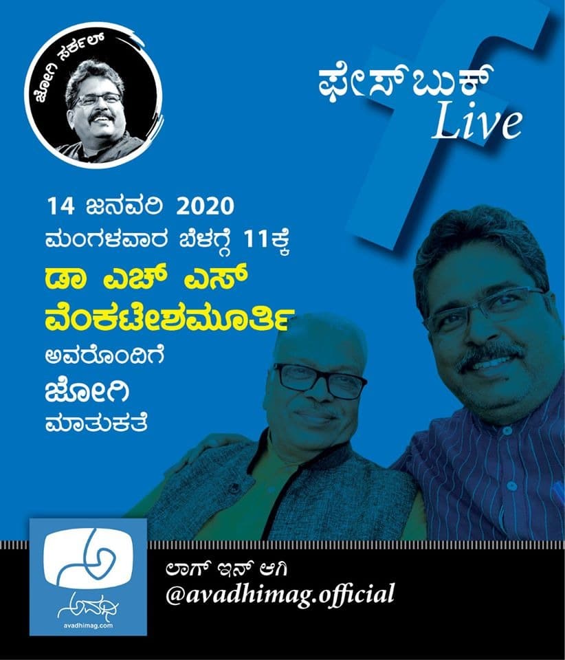 ೧೪ ಜನವರಿ ೨೦೨೦, ಮಂಗಳವಾರ ಬೆಳಿಗ್ಗೆ ೧೧ಕ್ಕೆ:-ಡಾ.ಎಚ್ ಎಸ್ ವೆಂಕಟೇಶಮೂರ್ತಿ ಅವರೊಂದಿಗೆ ಜೋಗಿ ಮಾತುಕತೆ. ಲಾಗಿ ಇನ್ ಆಗಿ @avadhimag.official