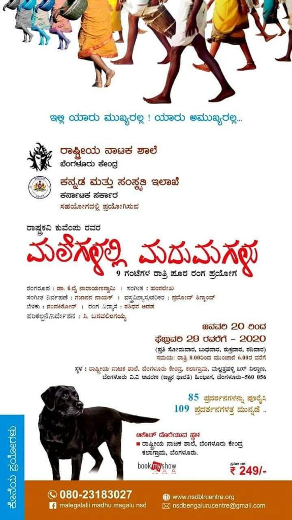 ಇಲ್ಲಿ ಯಾರು ಮುಖ್ಯರಲ್ಲ ! ಯಾರು ಅಮುಖ್ಯರಲ್ಲ . . . ರಾಷ್ಟ್ರೀಯ ನಾಟಕ ಶಾಲೆ ಬೆಂಗಳೂರು ಕೇಂದ್ರ ಕನ್ನಡ ಮತ್ತು ಸಂಸ್ಕೃತಿ ಇಲಾಖೆ ಕರ್ನಾಟಕ ಸರ್ಕಾರ ಸಹಯೋಗದಲ್ಲಿ ಪ್ರಯೋಗಿಸುವ ರಾಷ್ಟ್ರಕವಿ ಕುವೆಂಪು ರವರ ಮಲೆಗಳಲ್ಲಿ ಮದುಮಗಳು 9 ಗಂಟೆಗಳ ರಾತ್ರಿ ಪೂರ ರಂಗ ಪ್ರಯೋಗ ರಂಗರೂಪ : ಡಾ . ಕೆ . ವೈ ನಾರಾಯಣಸ್ವಾಮಿ | ಸಂwತ : ಹಂಸಲೇಖ ಸಂಗಿತ ನಿರ್ವಹಣೆ : ಗಜಾನನ ನಾಯಕ್ | ವಸ್ತ್ರವಿನ್ಯಾಸ / ಪರಿಕರ : ಪ್ರಮೋದ್ ಶಿಗ್ಗಾಂವ್ ಬೆಳಕು : ನಂದಕಿಶೋರ್ | ರಂಗ ವಿನ್ಯಾಸ : ಶಶಿಧರ ಅಡಪ ಪರಿಕಲ್ಪನೆ / ನಿರ್ದೇಶನ : ಸಿ . ಬಸವಲಿಂಗಯ್ಯ ಜನವರಿ 20 ರಿಂದ ಫೆಬ್ರುವರಿ 29 ರವರೆಗೆ – 2020 ( ಪ್ರತಿ ಸೋಮವಾರ , ಬುಧವಾರ , ಶುಕ್ರವಾರ , ಶನಿವಾರ ) ಸಮಯ : ರಾತ್ರಿ 8 . 00ರಿಂದ ಮುಂಜಾನೆ 6 . 00ರ ವರೆಗೆ ಸ್ಥಳ : ರಾಷ್ಟ್ರೀಯ ನಾಟಕ ಶಾಲೆ , ಬೆಂಗಳೂರು ಕೇಂದ್ರ , ಕಲಾಗ್ರಾಮ , ಮಲ್ಲತ್ತಹಳ್ಳಿ ಬಸ್ ನಿಲ್ದಾಣ , ಬೆಂಗಳೂರು ವಿ . ವಿ ಆವರಣ ( ಜ್ಞಾನ ಭಾರತಿ ) ಹಿಂಭಾಗ , ಬೆಂಗಳೂರು – 560 056 85 ಪ್ರದರ್ಶನಗಳನ್ನು ಪೂರೈಸಿ 109 ಪ್ರದರ್ಶನಗಳತ್ತ ಮುನ್ನಡೆ . . ಕೊನೆಯ ಪ್ರಯೋಗಳು ಟಿಕೇಟ್ ದೊರೆಯುವ ಹಳ ರಾಷ್ಟ್ರೀಯ ನಾಟಕ ಶಾಲೆ , ಬೆಂಗಳೂರು ಕೇಂದ್ರ ಕಲಾಗ್ರಾಮ , ಬೆಂಗಳೂರು . bookmyshow 249 /hoon ೧ 080 – 23183027 # malegalalli madhu magalu nsd VyxNW . As blrcentre . org ೩ nsdbengaluruCentre @ gmail . com