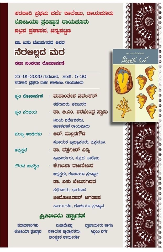 ಸರಕಾರಿ ಪ್ರಥಮ ದರ್ಜೆ ಕಾಲೇಜು , ರಾಯಚೂರು ಲೋಹಿಯಾ ಪ್ರತಿಷ್ಠಾನ ರಾಯಚೂರು ಪಲ್ಲವ ಪ್ರಕಾಶನ , ಚನ್ನಪಟ್ಟಣ. ಡಾ . ಬಸು ಬೇವಿನಗಿಡದ ಅವರ ನೆರಳಿಲ್ಲದ ಮರ, ಕಥಾ ಸಂಕಲನ ಲೋಕಾರ್ಪಣೆ ೨೩/೦೧/೨೦೨೦ ಗುರುವಾರ , ಸಂಜೆ : ೫.೩೦ ಸರಕಾರಿ ಪ್ರಥಮ ದರ್ಜೆ ಕಾಲೇಜು , ರಾಯಚೂರು ಕೃತಿ ಲೋಕಾರ್ಪಣೆ : ಮಹಾಂತೇಶ ನವಲಕಲ್ ಕಥೆಗಾರರು , ಕಲಬುರಗಿ ಕೃತಿ ಪರಿಚಯ : ಡಾ . ಬಿ . ಎಂ . ಶರಭೇಂದ್ರ ಸ್ವಾಮಿ ನಿಲಯ ನಿರ್ದೇಶಕರು , ಆಕಾಶವಾಣಿ ರಾಯಚೂರು ಮುಖ್ಯ ಅತಿಥಿಗಳು : ಆರ್ . ಮಲ್ಲನಗೌಡ ಸಹಾಯಕ ಪ್ರಾಧ್ಯಾಪಕರು , ಸ . ಪ್ರ . ದ . ಕಾ . ಅಧ್ಯಕ್ಷತೆ : ಡಾ . ದಸ್ತಗೀರ್ ದಿನ್ನಿ ಪ್ರಾಚಾರ್ಯರು , ಸ . ಪ್ರ . ದ . ಕಾಲೇಜು ಗೌರವ ಉಪಸ್ಥಿತಿ : ಕೆ . ಗಿರಿಜಾ ರಾಜಶೇಖರ ಅಧ್ಯಕ್ಷರು , ಲೋಹಿಯಾ ಪ್ರತಿಷ್ಠಾನ ಡಾ . ಬಸು ಬೇವಿನಗಿಡದ ಕಥೆಗಾರರು , ಧಾರವಾಡ ಭೀಮೋಜಿರಾವ್ ಜಗತಾಪ ಕಾರ್ಯದರ್ಶಿ , ಲೋಹಿಯಾ ಪ್ರತಿಷ್ಠಾನ .