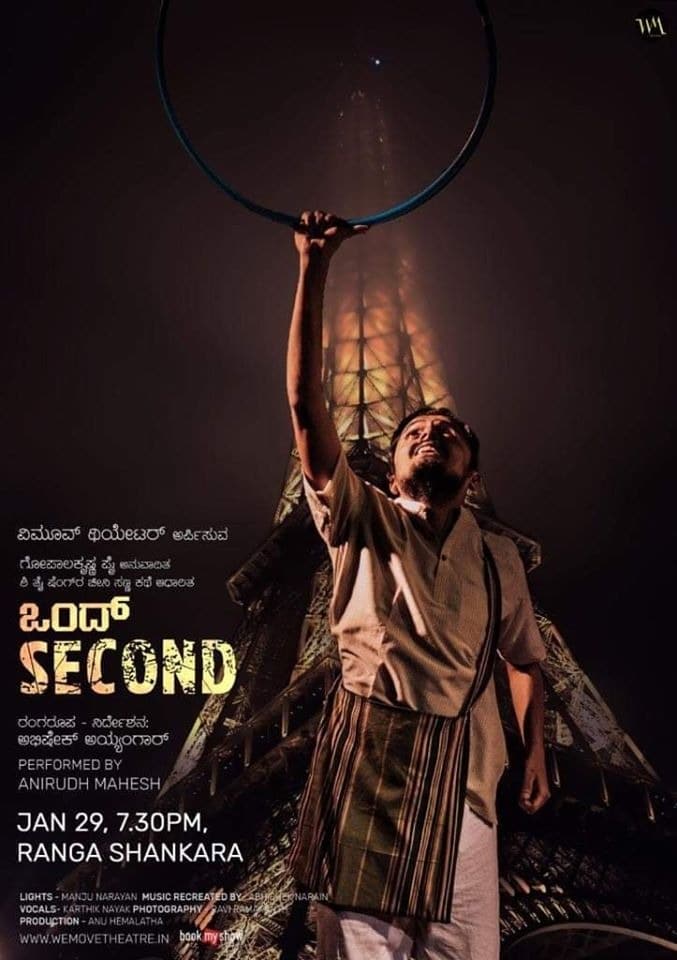 ವಿಮೂವ್ ಥಿಯೇಟರ್ ಅರ್ಪಿಸುವ ಗೋಪಾಲಕೃಷ್ಣ ಪೈ ಅನುವಾದಿತ ಅ ಪೈ ಪೆಂಗ್ರ ಚೀನಿ ಸಣ್ಣ ಕಥೆ ಆಧಾರಿತ ಒಂದ್ SECOND ರಂಗರೂಪ – ನಿರ್ದೇಶನ : ಅಭಿಷೇಕ್ ಅಯ್ಯಂಗಾರ್ ; PERFORMED BY ANIRUDH MAHESH